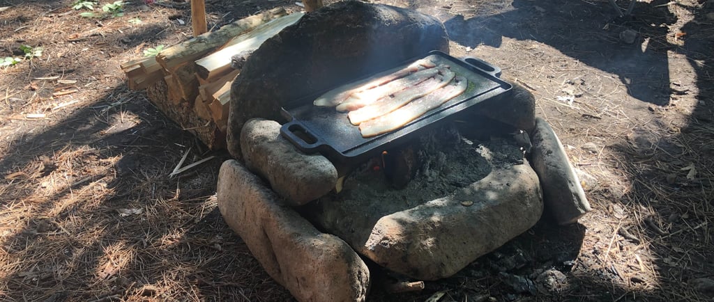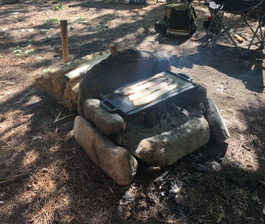 One example of how a friend of mine had spent a portion of his winter was, while helping a neighbor clean out an abandoned barn, he discovered an old Griddle. He asked if he could keep it and, the neighbor simply grinned and replied, "yes". My friend took it back to his shed and immediately proceeded to clean it up. He set it aside for a week or two and finally found the time to "re-season" the cast iron and...well...the picture above was taken while we cooked some bacon on it during it's reintroduction to the outdoors after being refurbished!!! Speaking of the photo above, the same friend is also the one that built this cooking structure from rocks that he found around the Campsite. These are two PRIME examples of how you may find Bushcrafters spending their time at Camp and, how they might spend their time preparing for the event as well. This Griddle is now a prized possession of my friends cooking "kit" and, will certainly be a conversation piece for many years to come. Anyone else may have simply thrown the old Griddle away but, he not only found it while helping a neighbor, he also earned it by the work that he put into bringing it back to life!